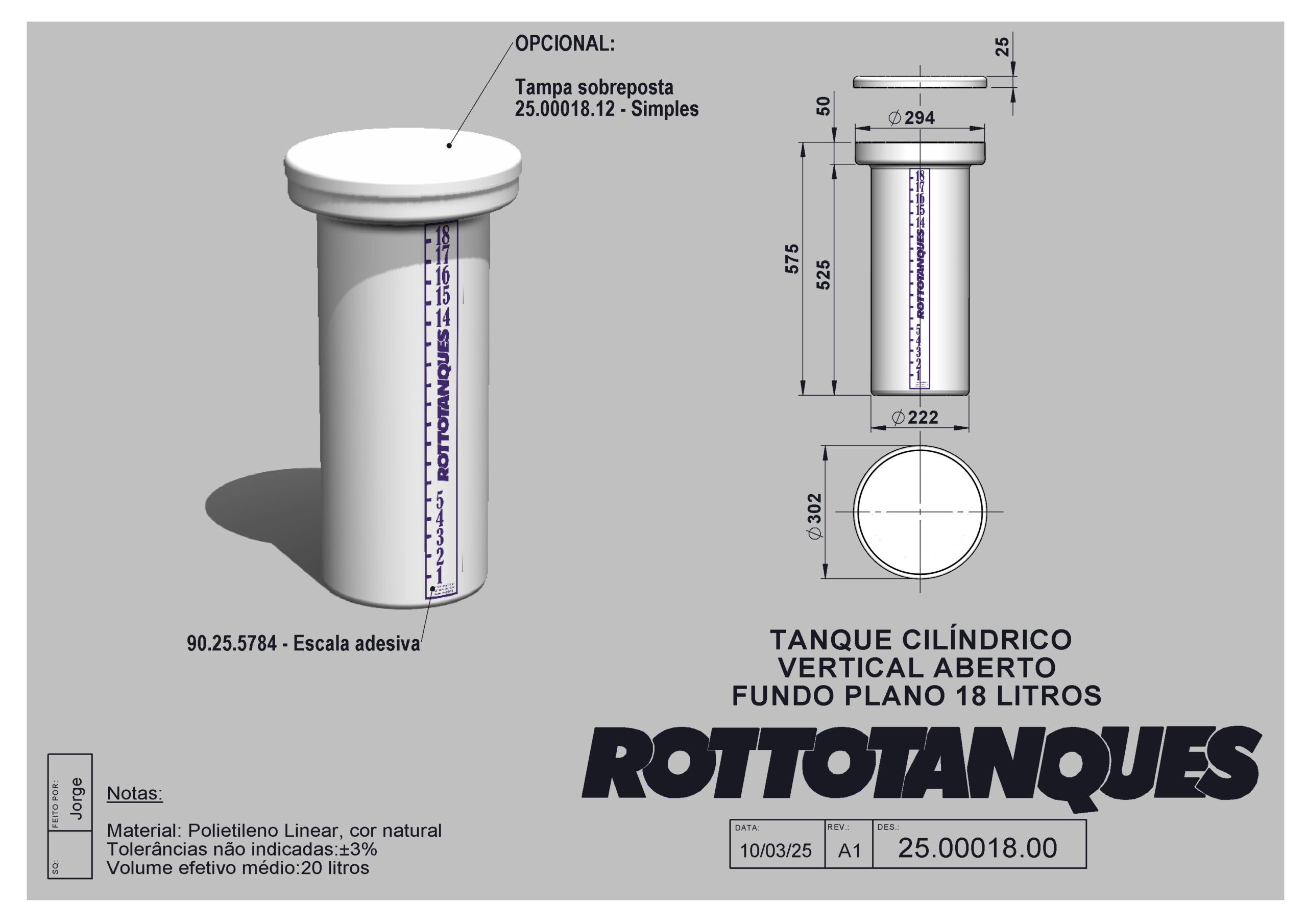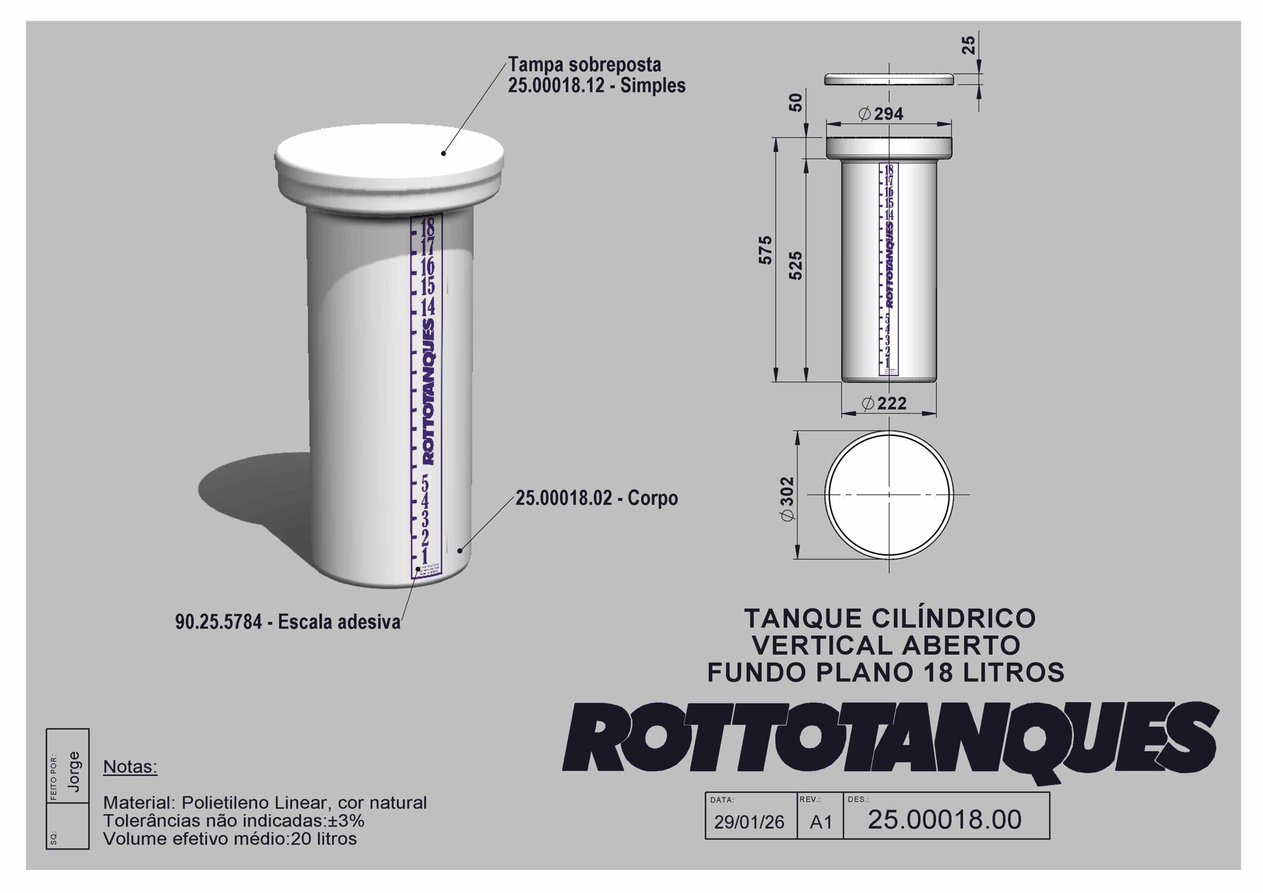 Tanque cilíndrico vertical aberto fundo plano de 18 litros